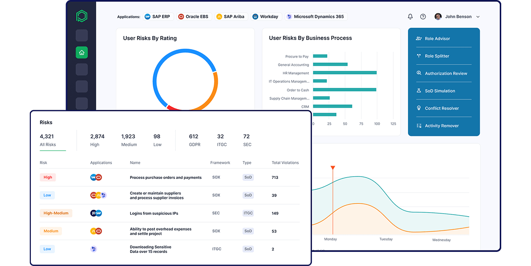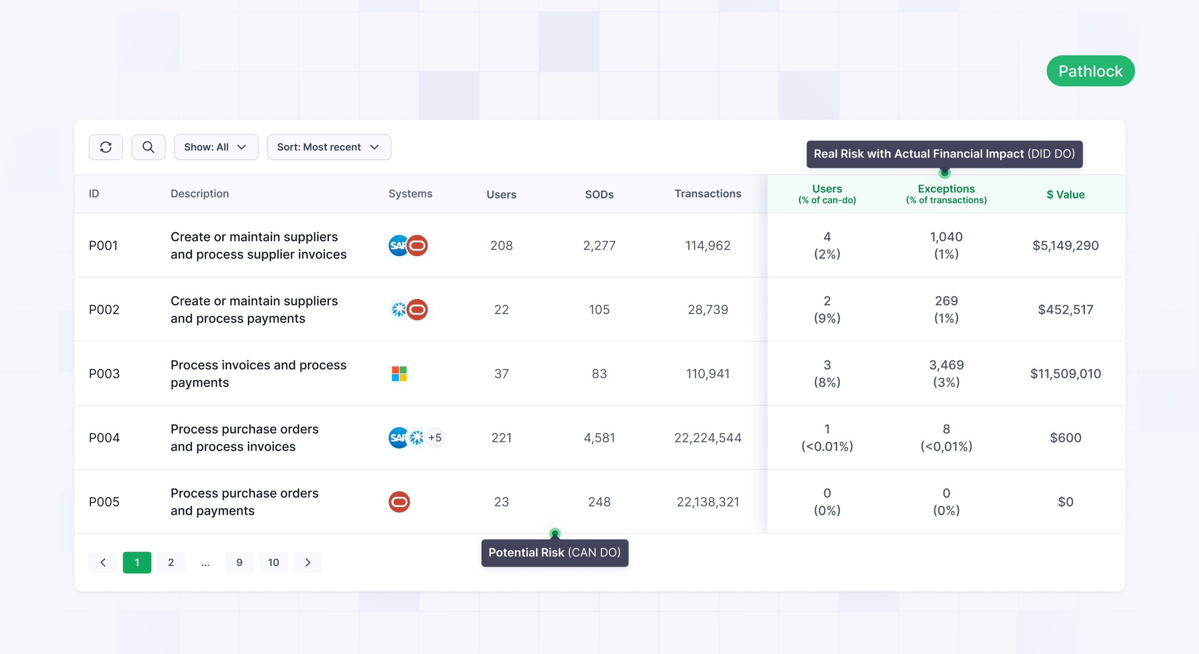 Pathlock helps you stay audit-ready year-round by automating control oversight, quantifying financial exposure, and detecting exceptions as they occur.