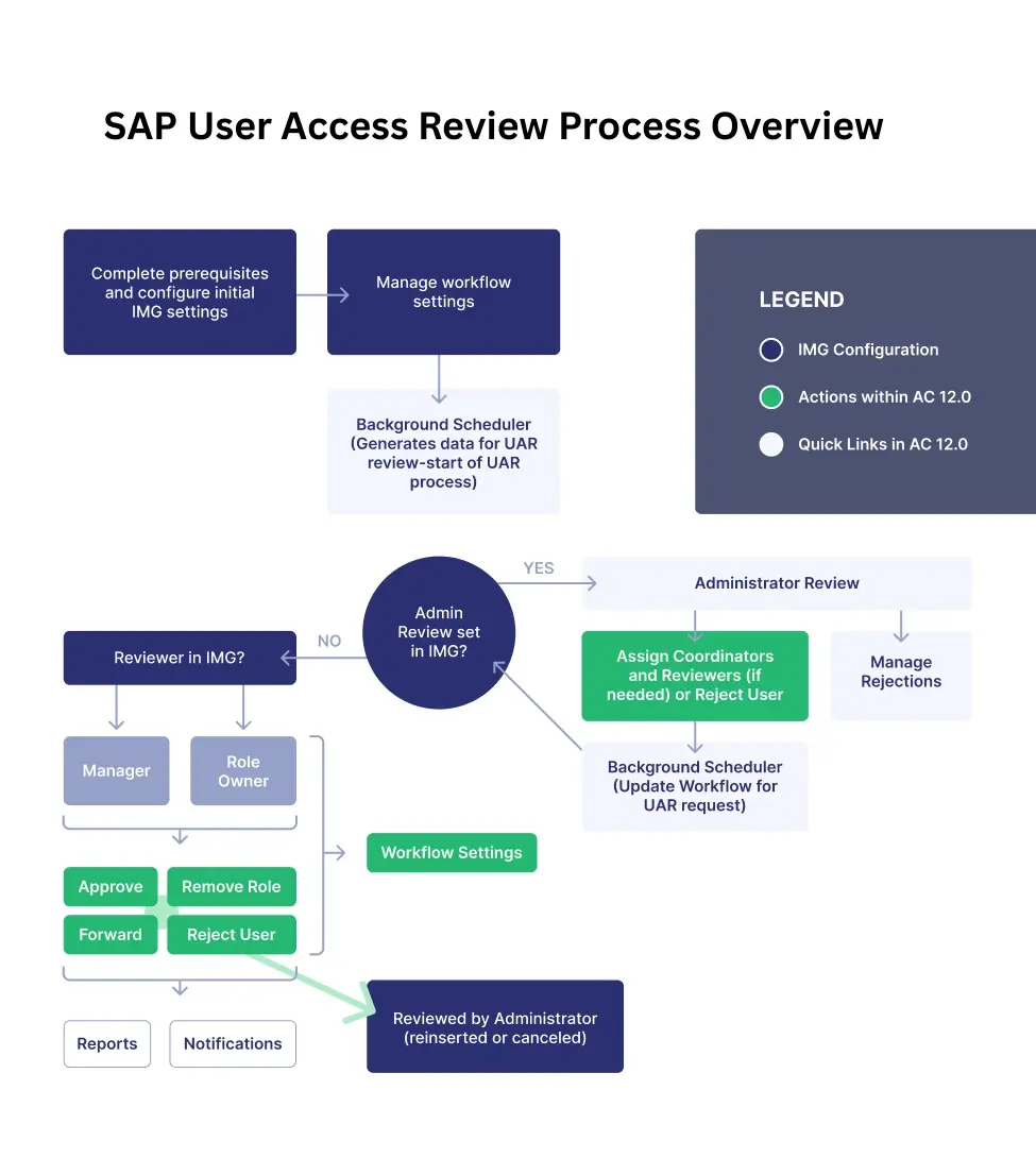 SAP User Access Review is a centralized, automated process that provides a workflow-based review and approval mechanism to validate that users have only the necessary permissions required for their job roles, reducing the risk of unauthorized access. Managers and role owners perform periodic reviews of user access against scheduled requests generated by the system based on the organization’s internal control policy.