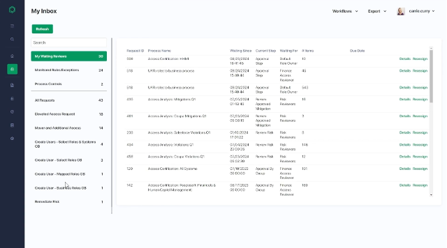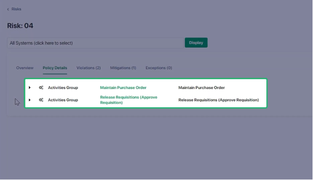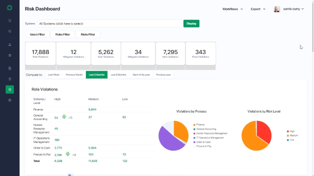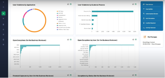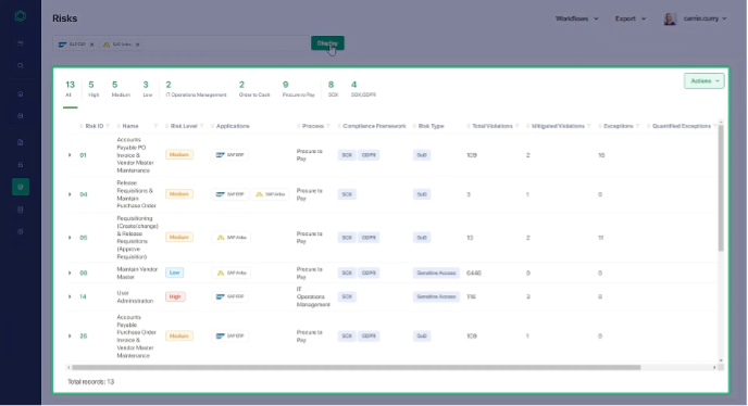 - Enables visibility into risk quantification tied to transactions. Potential SoD violations are detected and assessed financially, allowing compliance teams to prioritize remediation based on monetary impact.