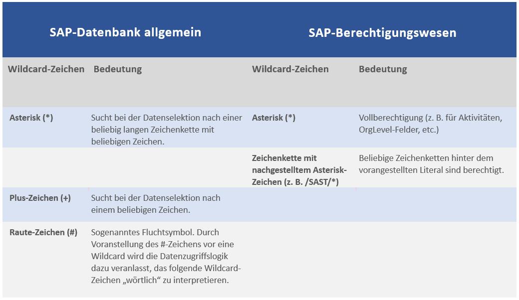 Sowohl die technischen Funktionen zum Datenzugriff des SAP NetWeaver ABAP Applikationsservers zur SAP-Datenbank als auch das SAP-Berechtigungswesen erlauben die Verwendung von sogenannten Wildcard-Zeichen, wie beispielsweise das Asterisk-Symbol (*) oder Pluszeichen (+). Die SAP spricht hier auch von Maskierungszeichen. In beiden Anwendungsbereichen haben diese Zeichen mitunter unterschiedliche Bedeutung und liefern bei der Auswertung von Datensätzen im Data Browser (SUIM) oftmals überraschende Ergebnisse. Die folgende Tabelle stellt Bedeutung und Wirkung verschiedener Wildcard-Zeichen beim SAP-Datenbankzugriff am Beispiel des Data Browsers allgemein und im SAP-Berechtigungswesen gegenüber: