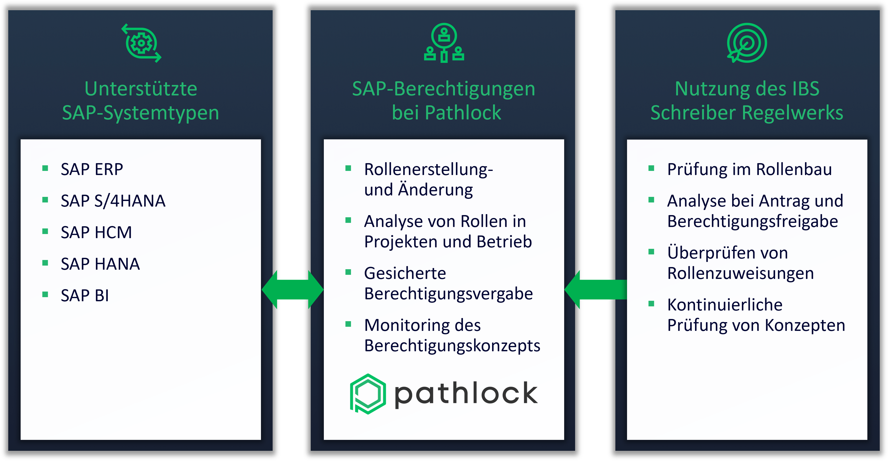 Dabei bietet das zertifizierte IBS Schreiber Risikoregelwerk eine profunde Ergänzung zu unseren eigenentwickelten Pathlock-Regelwerken, die auf den Empfehlungen der SAP, DSAG und des BSI basieren. Sie können in den verschiedensten Bereichen Ihres Unternehmens eingesetzt werden.