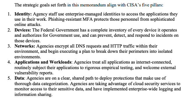 If you’re a state or local government, I recommend that you review the White House’s zero trust strategy document. You won’t be bound by their mandated timelines, but the document is full of best practices and sound advice. Briefly, the security goals are based on the maturity model developed by the Cybersecurity and Infrastructure Security Agency. CISA’s zero trust model describes five complementary areas of effort (Image Source: White House):