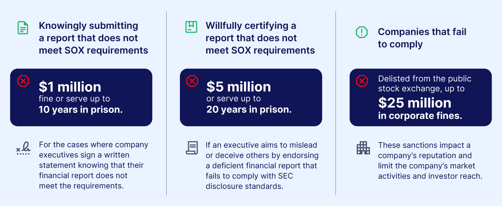 - Willfully certifying a report that does not meet SOX requirements: $5 million or serve up to 20 years in prison. An executive faces the most brutal consequences if they aim to mislead or deceive others by endorsing a deficient financial report that fails to comply with SEC disclosure standards.