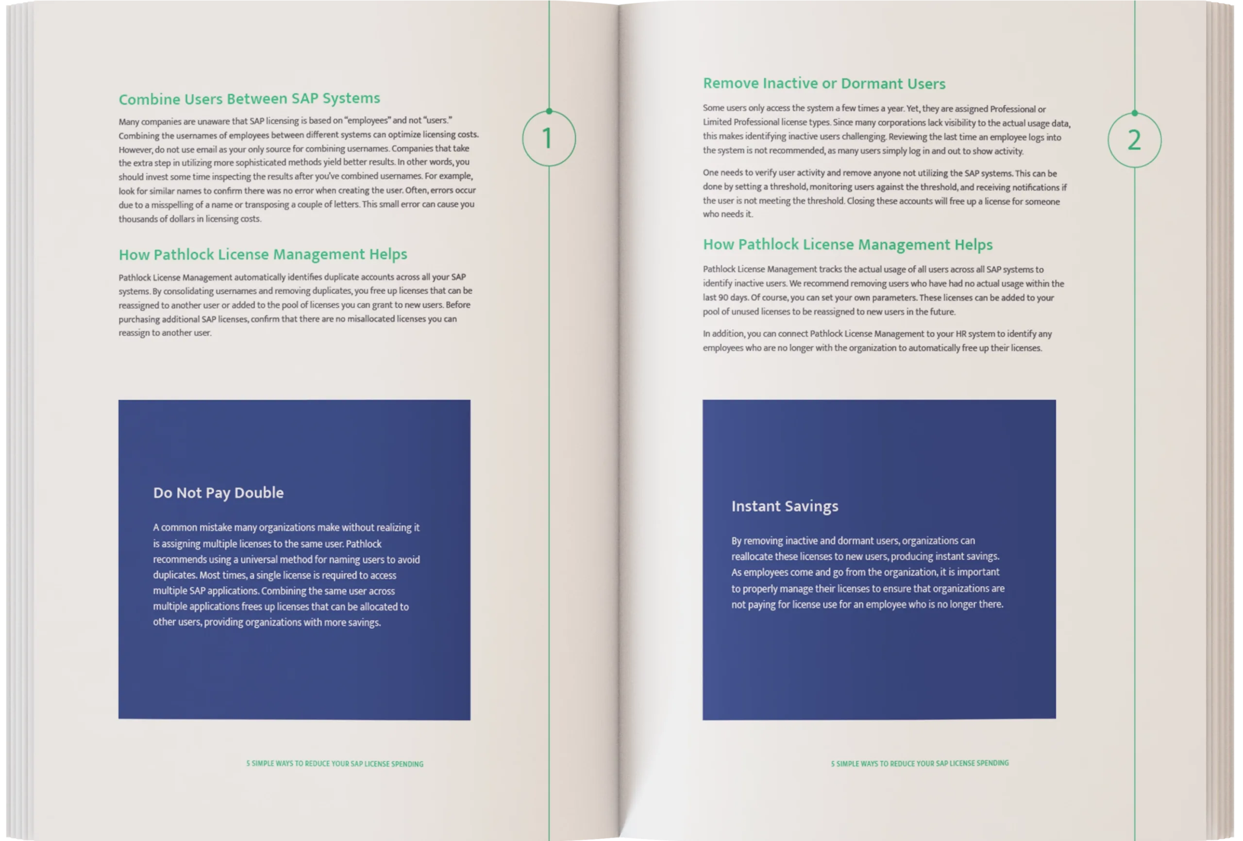 SAP licensing can feel complex and costly. This eBook reveals five simple strategies to optimize license allocation, eliminate duplicate users, remove dormant accounts, correctly classify user roles, and manage indirect access risks. With Pathlock License Management, you gain complete visibility into your SAP environment, automate compliance, and save up to 90% per license classification before your next SAP audit or renewal.