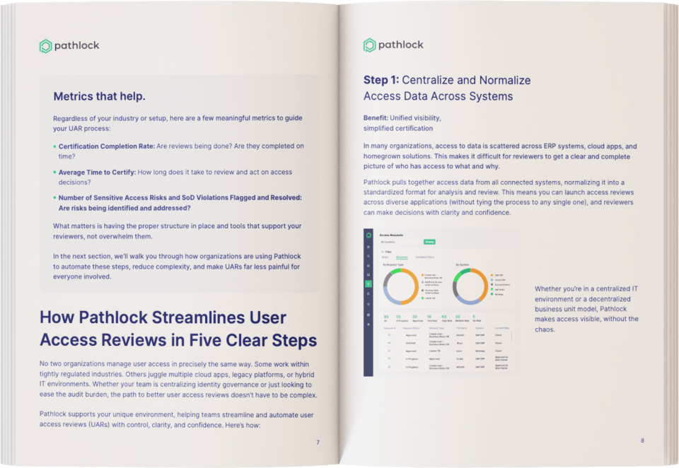 User Access Reviews (UARs) are critical but often manual, inconsistent, and risky. This eBook explores the most common UAR challenges, modern best practices, and how Pathlock simplifies compliance. Learn how to automate certifications, enforce SoD policies, and enable context-rich decisions across systems. With Pathlock, organizations achieve faster audits, lower risk, and smarter access control at scale.