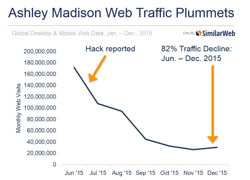 Reports have come to light that the online dating service has taken a tremendous hit. Since the attack in July, global web traffic for the site has dropped 82 percent. According to the International Business Times, Ashley Madison has seen a drop from 171 million users in June to only 31 million users in December. Prior to the attack, Canada and the United States had the most users, with the United States accounting for 28 percent of the entire global web traffic. Today, however, the United States accounts for only 4.6 percent of the online dating service providers global web traffic.